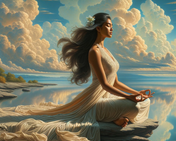 Prompt: Create an ethereal fantasy scene featuring a serene female figure seated gracefully, embodying a sense of peace and wisdom. She has long, flowing hair that is a soft shade of silver, cascading around her shoulders. Her skin tone is fair with a gentle glow, and her facial features are delicate and symmetrical. She is adorned in a flowing blue gown that harmonizes with the tranquil colors of the background.
