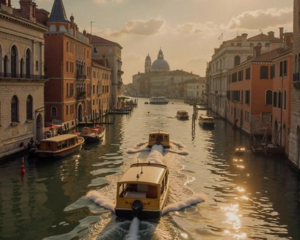 Prompt: Digital matte painting. Medium shot. A vintage postcard shows the Grand Canal in Venice. Boats glide on shimmering water near old buildings and a palazzo. Golden hour lighting. Painterly realism. Hand-tinted postcard aesthetic. Subtle grain texture. Nostalgic atmosphere. Travel-poster mood. Warm tones. 1950s vintage postcard design. Richly detailed.