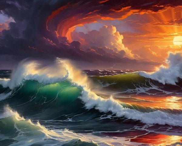 Prompt: Dramatic, Romantic-era-inspired seascape of a turbulent, stormy ocean, billowing waves and dynamic, expressive brushstrokes à la J.M.W. Turner.