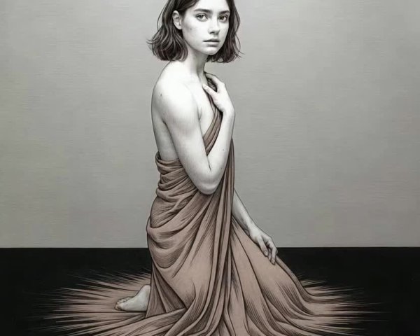 Prompt: Generate an image featuring two female figures illustrated in contrasting styles. On the left, portray a slender, fair-skinned woman with short, red hair in a bobline. She is posed gracefully, holding a red and white sheer fabric that drapes around her lower body. Her skin is smooth and unblemished, with delicate facial features that are highlighted by subtle, elegant makeup, emphasizing her dark eyes.