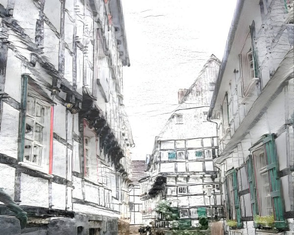 Prompt: marbled paper, twisted trees night landscape summer town, ink style of Margaret MacDonald Mackintosh, watercolor style of Frances MacDonald McNair, scratchboard illustration style of Nicolas Delort,