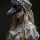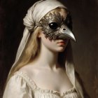 Prompt: Portrait of a young woman with pale skin and long blonde hair, wearing an elaborate bird mask with large, glossy black eyes and a long, pointed beak, draped fabric head covering, a flowing white muslin gown with gathered neckline, Baroque painting style, muted earthy tones, soft diffuse lighting, chiaroscuro effect, subtle textures throughout, somber introspective mood, shallow depth of field, medium close-up perspective, symmetrical composition, dark neutral background.