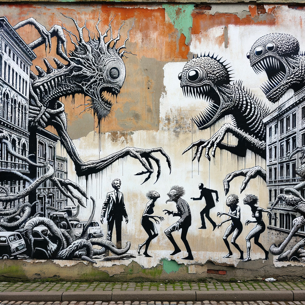 Vibrant Mural with Whimsical Caricatures and Surrealism