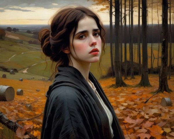 Prompt: Traditional Japanese ink wash painting, infused with the deep, mysterious atmosphere found in Kupkarina's work, blurring the boundaries between form and abstraction. A young woman sits gracefully in a tranquil studio, her upper body facing the viewer, eyes softly closed in serene contemplation. Her dark, curly hair is elegantly swept into a loose updo, with delicate gold earrings catching the faintest glimmer of light. She wears a flowing, sheer black dress that drapes gently over her bare shoulders, one hand resting lightly on her chest, the other caressing the fabric. The background is an abstract wash of smoky charcoal tones, blending subtle gradients of ink in soft, flowing strokes, evoking a sense of dreamlike stillness. The fluidity of the ink mirrors wabi-sabi’s embrace of imperfection, with organic brushwork that feels alive and spontaneous. The texture of the brushstrokes and the delicacy of the gradations of dark ink emphasize the beauty of natural wear and impermanence. The artist’s signature, though present, is subtly placed in the top left corner, as if part of the piece’s evolving energy. This piece channels the minimalism and delicate imperfection.