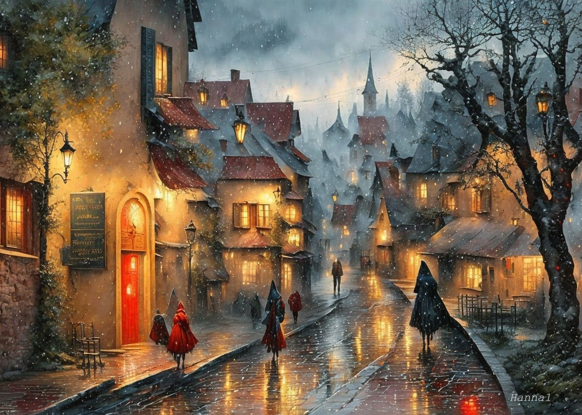 Quaint Village Scene with Snowfall and Lanterns