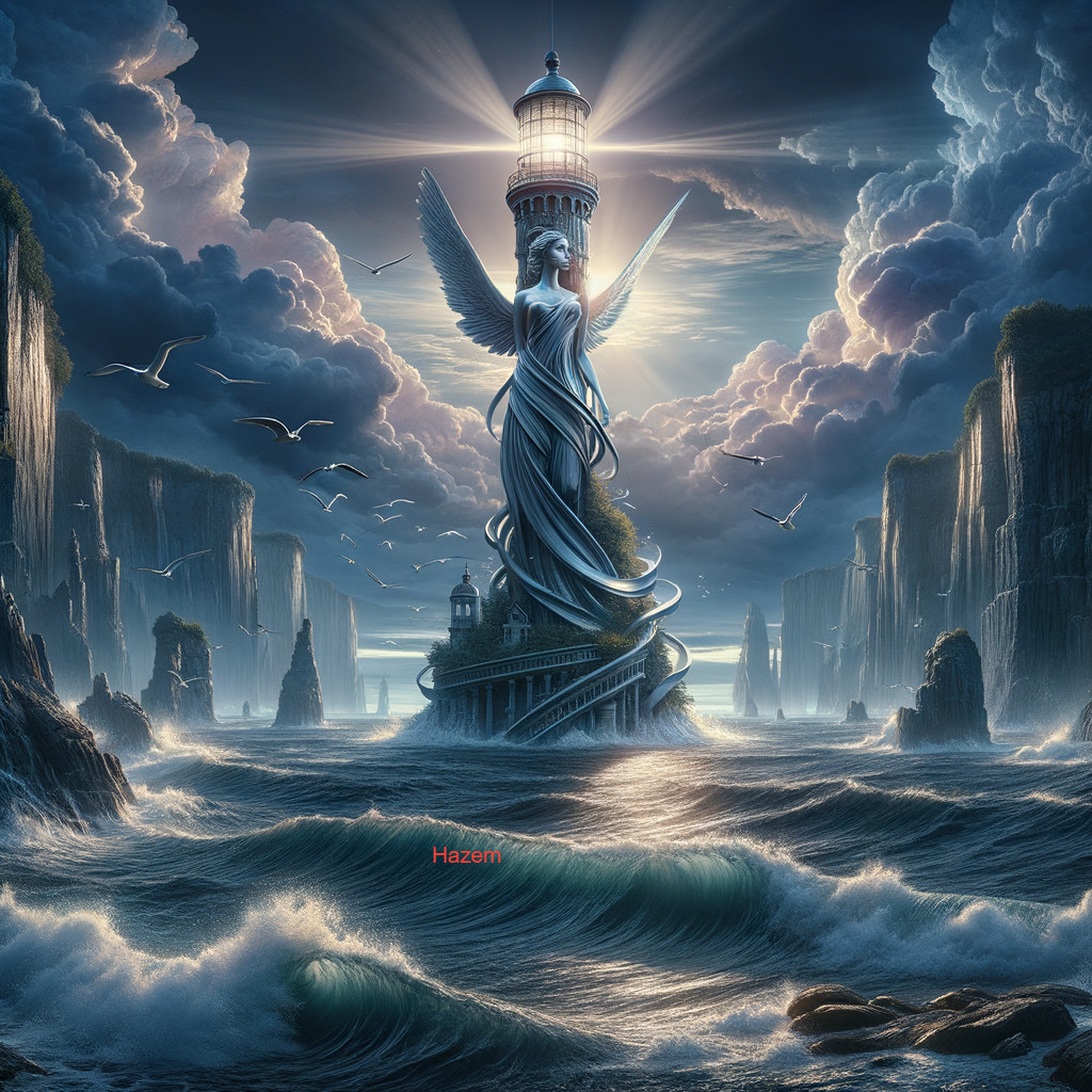 • Prompt: Majestic lady-shaped lighthouse, rising from the sea, surrounded by crashing waves, dramatic cliffs, stormy skies, seagulls in flight, intricate details on the lighthouse structure, glowing lantern at the top, serene moonlight, mystical aura, digital painting, fantasy elements, surreal color palette of deep blues, purples, and silver, ethereal lighting, enchanting and mysterious atmosphere, reminiscent of art by Caspar David Friedrich and J.M.W. Turner, high-resolution, Artstation.