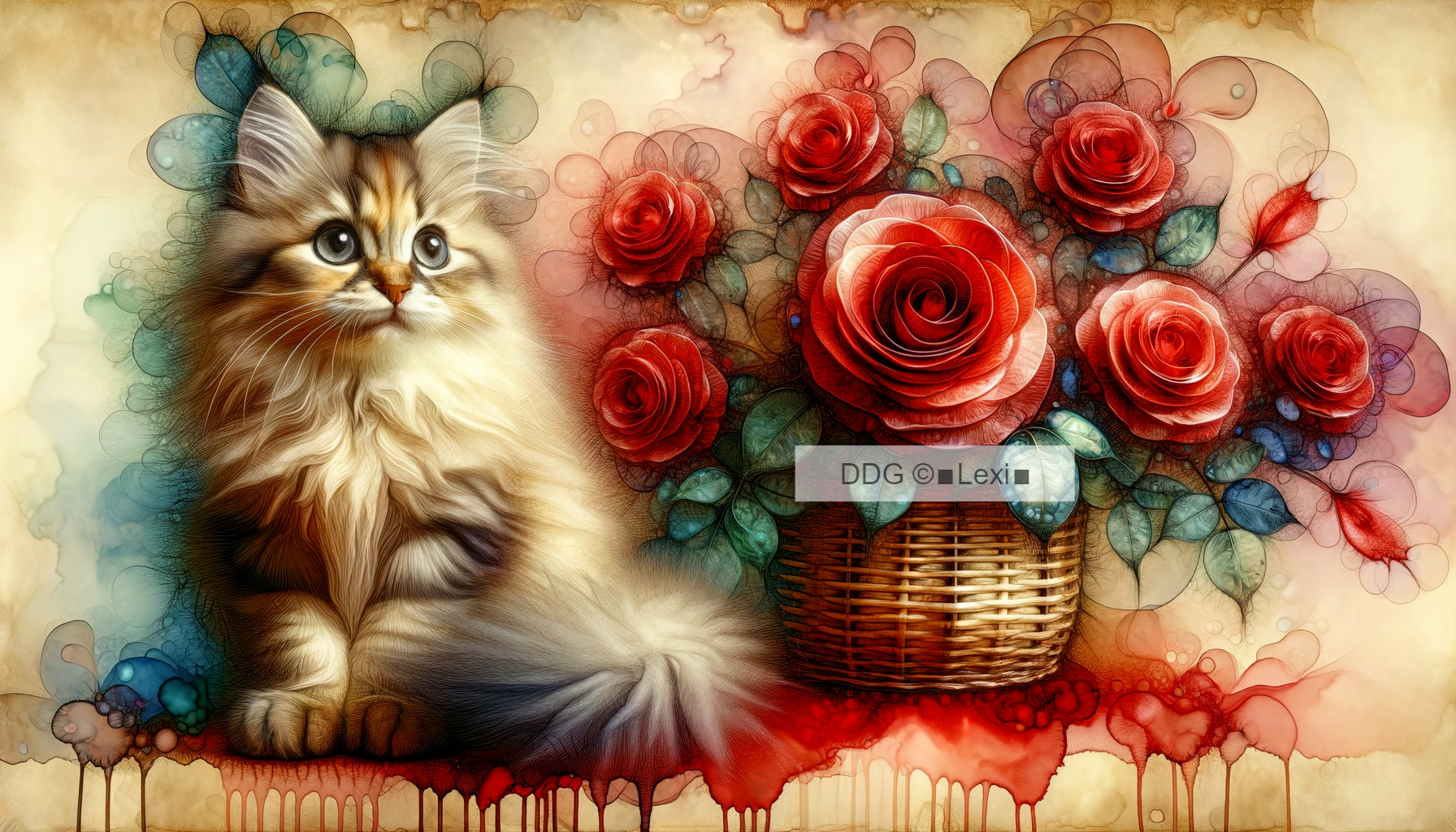 • Prompt: A very cute fluffy cat sitting next to a basket full of translucent red roses, alcohol ink, summer scene, intricate details by Jamie Heiden, Daniel Merriam, Paul Klee, Karol Bak, and Salvador Dali, ultra-detailed background, soft and harmonious color palette, high-definition crisp quality, intricate delicate brushstrokes, dreamlike atmosphere, ethereal lighting, Artstation.