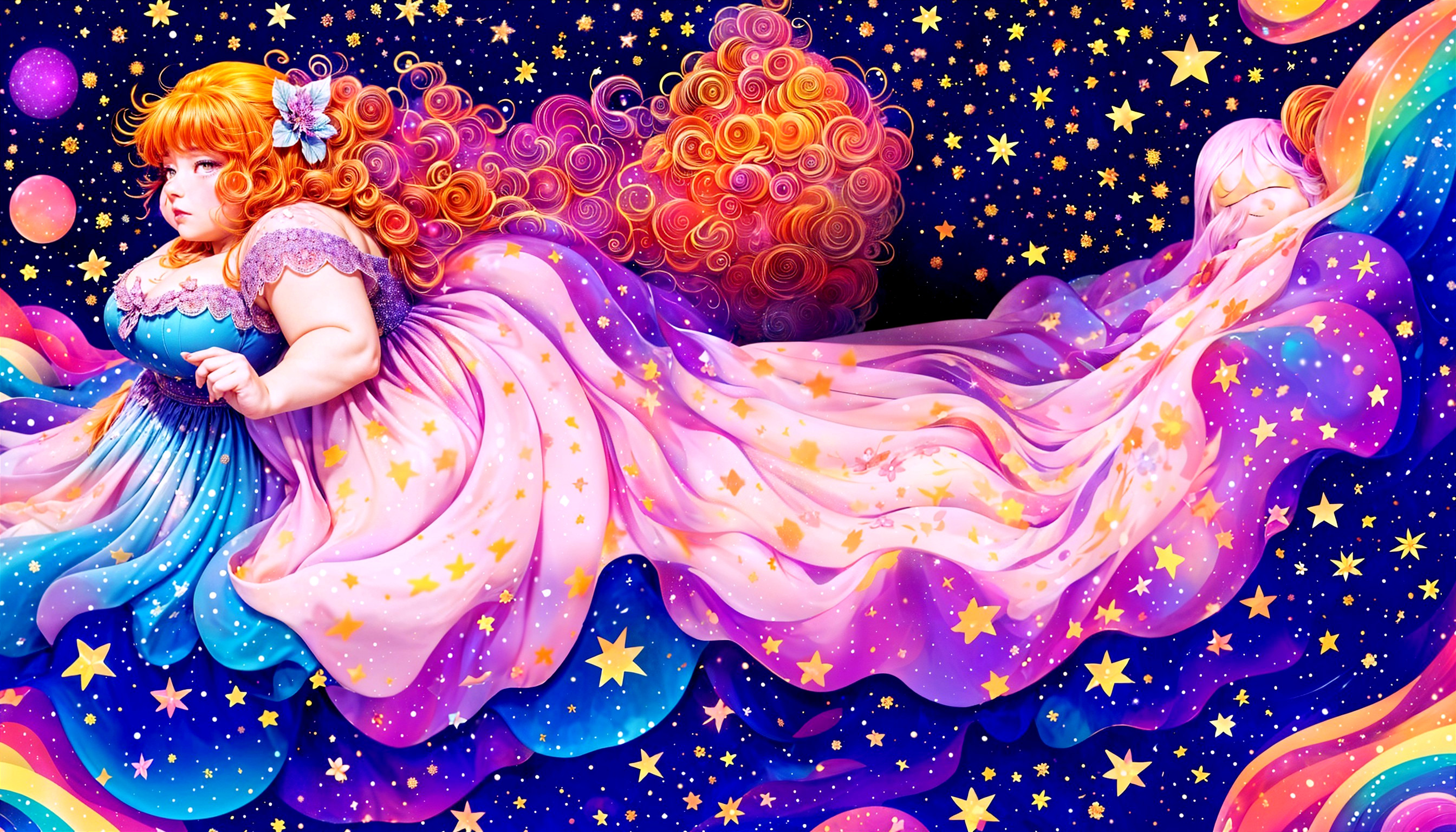 • Prompt: An illustration of a very large, plump woman wearing a very pretty, flowing dress and sleeping in a bed made of stars.