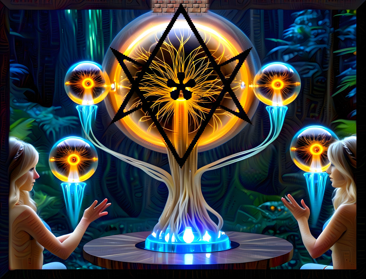 Prompt: A serene, ethereal figure made of flowing, tree-like branches flowing outwards from her head each branch ending with a mushroom light and they are twisting around 2 big trees in the background, kneeling inside a plasma ball that takes up the whole image size, evil twisted trees in an otherwise tranquil forest with mist surrounding ancient, towering trees. The figure cradles a glowing, round glass bowl containing vibrant golden glass mushrooms, symbolising harmony between nature and life. The forest is bathed in soft, blue light, creating a magical atmosphere. The figure’s hair and body intertwines seamlessly blend with the natural surroundings, highlighting a deep connection to the environment.