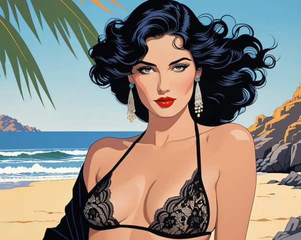 Prompt: 1980s painting in the style of Patrick Nagel. On a Southern California beach we see a beautiful Gypsy woman, hair flowing over her shoulders, wearing a lace bikini, Hyperdetailed, Delicate, a fusion of Art Deco and Pop Art, featuring bold, flat colors, sharp lines, and simplified, stylized forms of elegant women . Cinematic, 8K