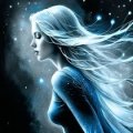 Prompt: A mysterious woman with long, flowing hair made entirely of frost and snow, blending seamlessly into the blizzard surrounding her. Her dress appears to be formed from cascading icicles and swirling snowdrifts. She stands in the center of an endless, wintry expanse, her glowing, icy-blue eyes piercing through the storm. Rendered in a surreal, abstract art style, with fluid, organic shapes and an otherworldly palette of whites, silvers, and subtle blues.