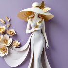Prompt: Elegant paper art sculpture of a female figure wearing a wide-brimmed hat, draped with a flowing golden ribbon. The figure is crafted in light gray paper, creating a delicate silhouette. Lavender-colored peonies and small golden butterfly accents surround the figure. The background is a soft white. The overall style is minimalist and sophisticated. The image is well-lit, emphasizing the textures and layers of the paper art. 3D paper craft.