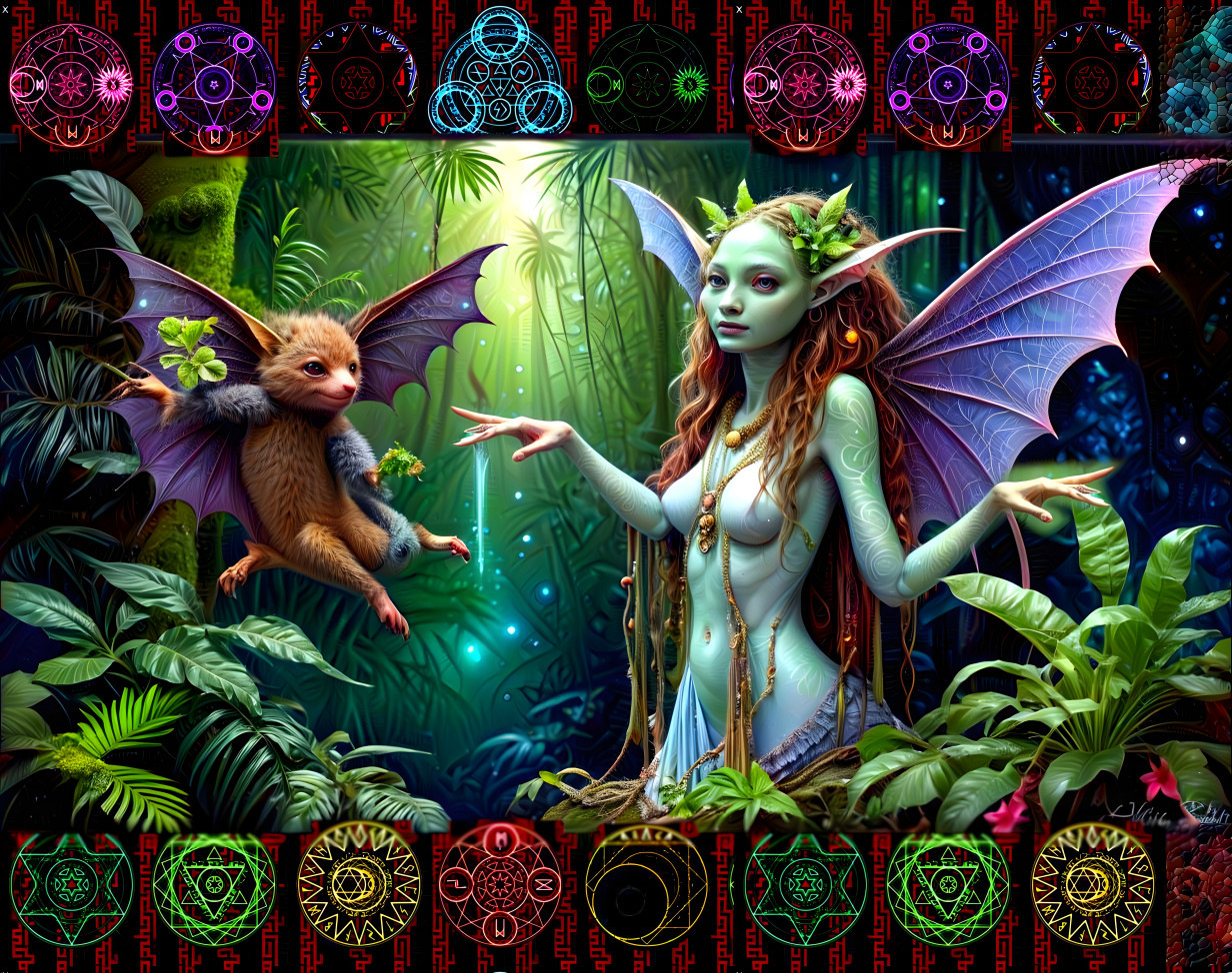 Prompt: A mystical scene featuring a towering pyramid in a vibrant jungle, surrounded by lush palm trees and exotic plants. In the foreground, a cloaked figure stands with a staff, gazing into a large, radiant eye that emerges from a swirling portal. The background is filled with ethereal colors, cosmic elements, and a starry sky, enhancing the otherworldly atmosphere. The landscape is dotted with ancient ruins and shimmers with magical energy, creating a sense of wonder and curiosity.