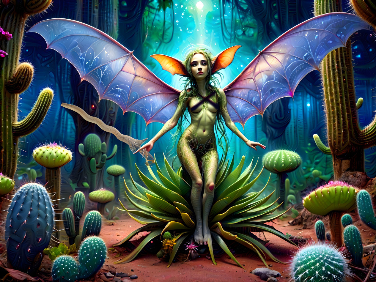 Prompt: A surreal, hyper-detailed scene of a UFO flying out of a glowing swirling vortex above an alien pyramid. The pyramid is ornate Intricate geometric light patterns and sacred geometry shapes. The scene is set in a desert oasis with cacti, palm trees, turqoise streams, and sandstone cliffs. As the UFO emerges, it leaves behind a dramatic trail of warped time and distorted space, light aberrations, filled with light fractals, swirling geometries, black-hole-like distortions, and rippling spatial anomalies that fracture and twist the desert scenery around it.