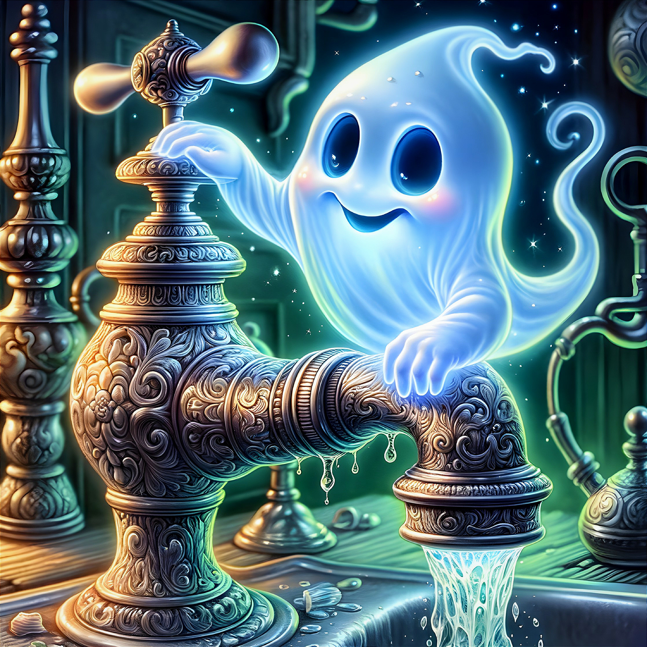 • Prompt: Imagine a sky made of flowing, living energy—no clouds, but streams of colors cascading down like waterfalls, constantly shifting and changing. In the center of these swirling colors stands a giant clock, but it doesn’t measure time—it measures fate. Each of the clock’s gears is made of sparkling stars, and between the hands, galaxies flow like sand through an hourglass. Below, a city rises, where the buildings are made of colossal roots and branches, stretching high into the sky, intertwined with one another. At the heart of this city floats a transparent sphere, within which rests an enormous creature—half human, half tree, with branches growing out of its arms, reaching toward the streams of the sky. Beneath its feet, golden light seeps from the ground, and instead of water, rivers of light flow through the streets, where translucent fish swim. The scene depicts not a concrete reality, but a dimension where time, nature, and space merge into one inseparable current.