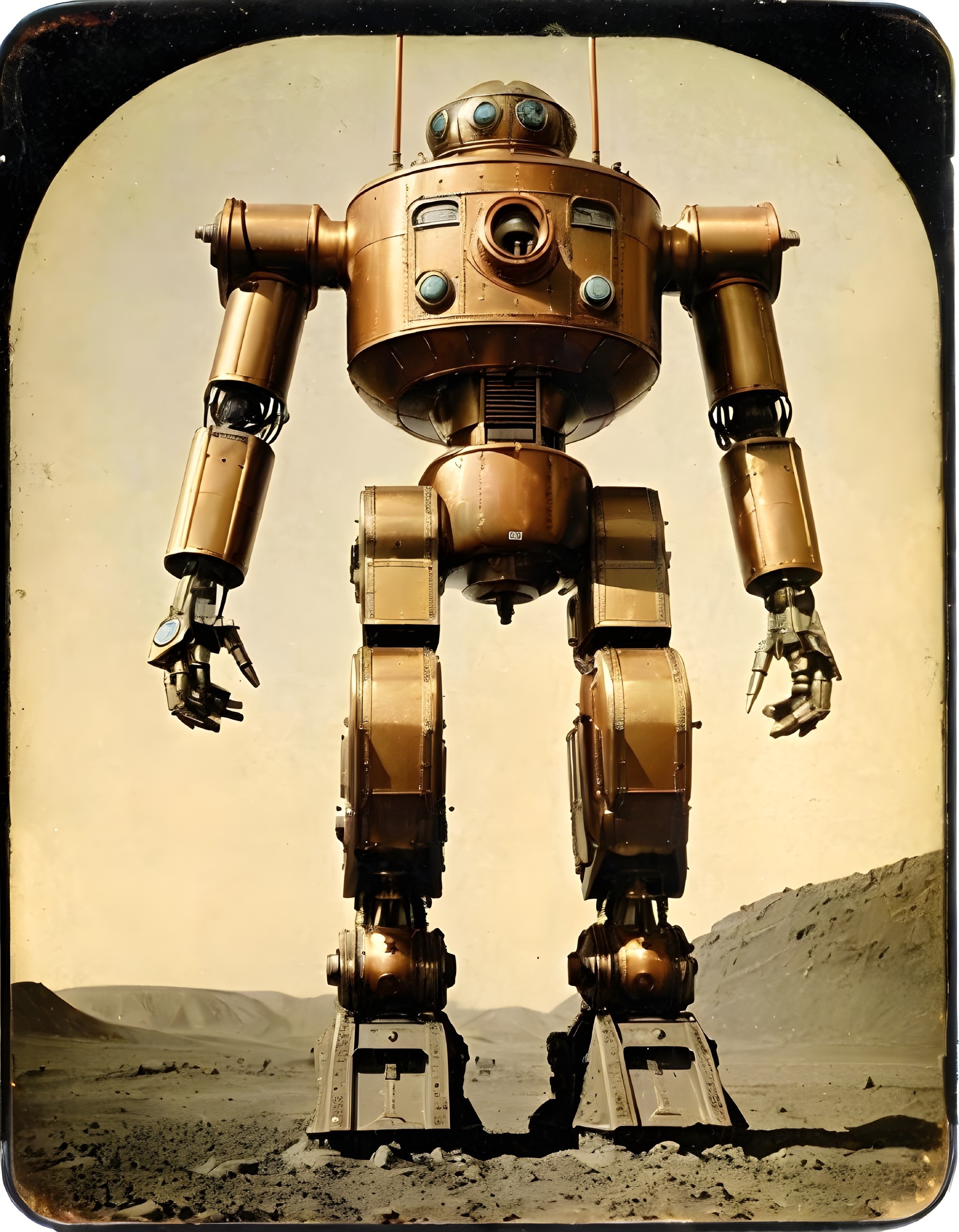 Retro-Futuristic Robot in Barren Landscape Setting 57w