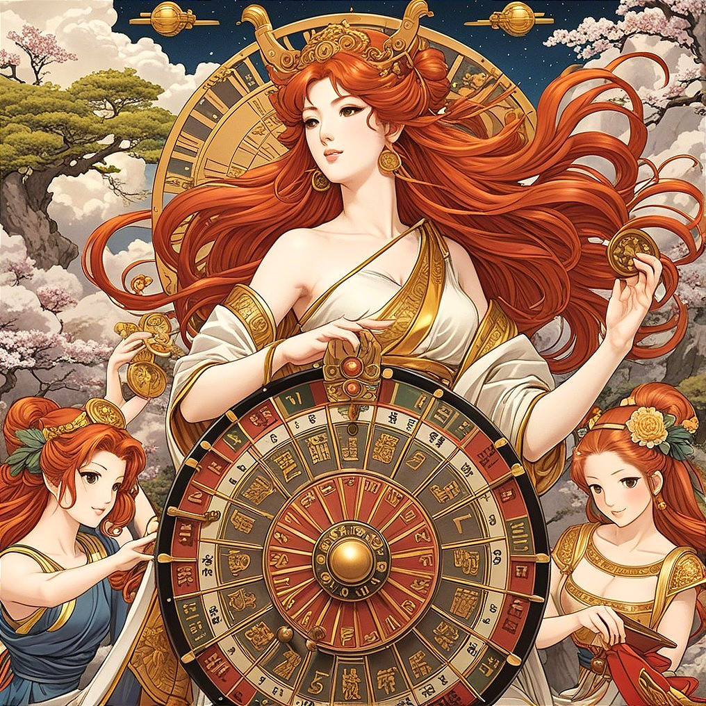 • Prompt: Mythology, the ancient Greek red-haired goddess spins the wheel of fortune. Manga, japanise art.