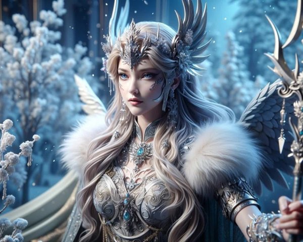 Prompt: A beautiful centaur girl with white hair, fair skin and big blue eyes stands against the backdrop of a blooming garden on a sunny day. The girl is wearing gold jewelry with blue sapphires.