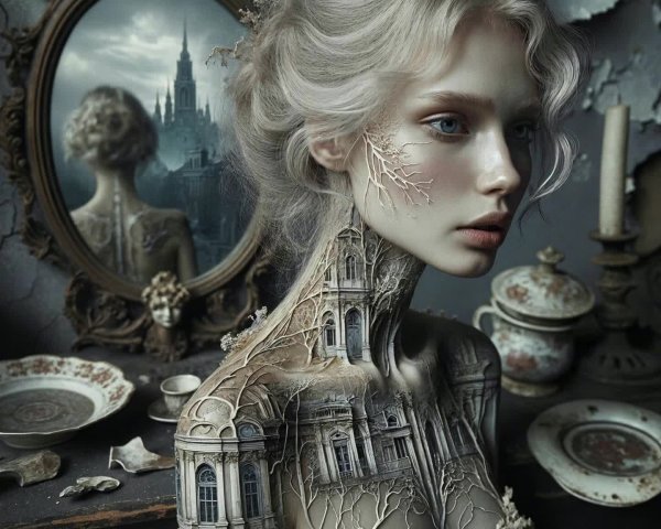 Prompt: A waist-up portrait of a 25-year-old woman, crafted in a fusion of Renaissance sculptural precision and chaotic abstraction. Her form is modeled with the weight and luminosity of marble, rendered through chiaroscuro in warm sepia tones. The scene balances timeless elegance with controlled visual disruption, where sculptural solidity meets gestural chaos.