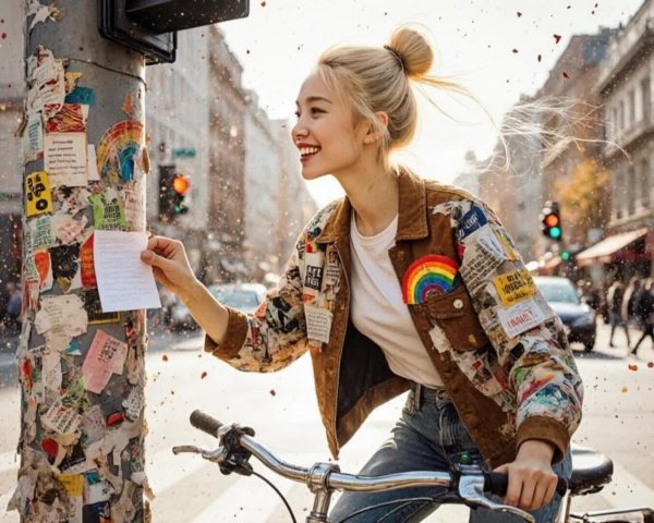She is wearing a mini skirt and legwarmers, chucks and a loose fitting t-shirt with deep neckline and a vintage suede jacket. It looks like her clothes just consists of colourful autumns leaves. Inspired by the works of Mimmo Rotella.