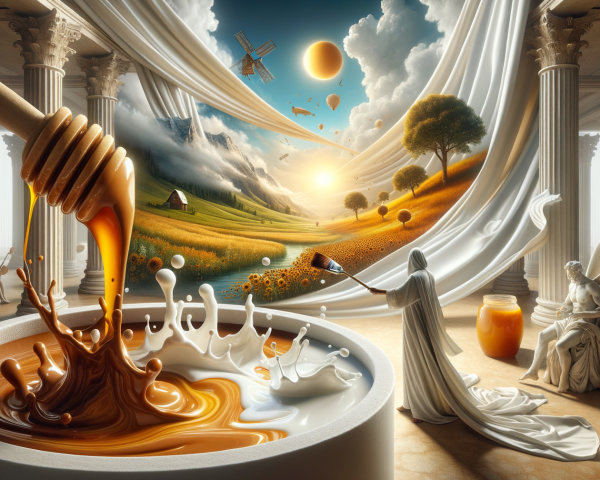*A world of honey, milk, and chocolate. A surreal and fantastical scene of a Renaissance master, depicted as a white marble statue, painting an enormous masterpiece, a hyperrealistic landscape featuring meadows, a windmill, a blazing sun, and his muse. His muse, draped in flowing white satin sheets, levitates, resembling a marble sculpture as she poses for him. From the painted canvas, molten chocolate bursts forth, flowing into the real world, blending with milk and cascading streams of honey that spill down a grand staircase. The scene is enclosed by towering ancient columns, while the once-sterile white chamber is overtaken by the swirling fusion of colours and textures. A modern reinterpretation of an everyday classical scene, with rich surrealism and dreamlike elegance.