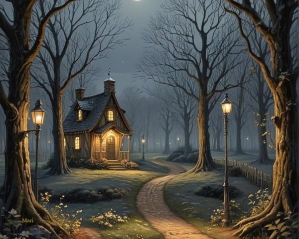 Prompt: A cozy wooden cabin with a tall spire stands at the snowy edge of a calm forest lake, warmly lit from within. The full moon shines brightly above, casting silver reflections on the water. Tall pine trees surround the scene, their branches heavy with snow, while blooming winter bushes add soft touches of color. A leafless tree with twisting branches frames the view. The atmosphere is magical, serene, and fairytale-like, with cinematic detail and soft moonlit lighting. style of Thomas Kinkade, Nadja Baxter, Anne Stokes, Nancy