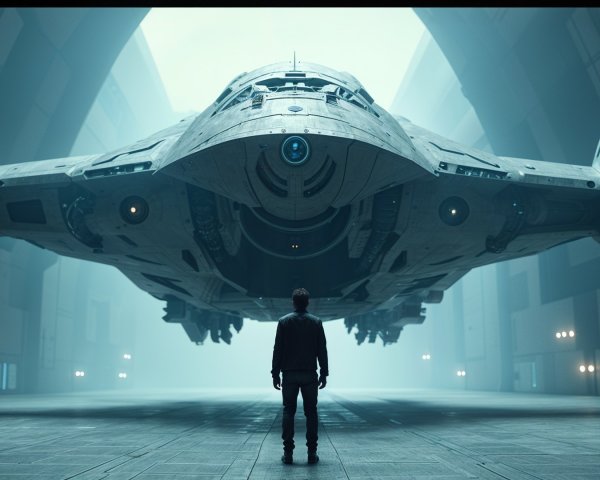 Prompt: Cinematic photo sci-fi style cinematic film still. A large, futuristic spaceship, metallic gray and silver, is parked in a hangar. The ship's design is complex and organic, with multiple wings, circular engines, and intricate details. Visible engine components feature glowing blue accents. The spaceship is positioned in the center of the image. The hangar floor is a light gray and dark gray patterned material. A lone figure, a dark-skinned man, in dark clothing, stands on the hangar floor, dwarfed by the enormous vessel. He is centered in the bottom half of the image, looking at the spaceship, facing the viewer. The lighting is focused on the ship and the man's form, creating strong highlights and shadows. The perspective is from slightly above the floor, providing a sense of scale and grandeur. The environment is a cavernous, modern hangar. The overall atmosphere is one of advanced technology and futuristic exploration. The composition is dynamic and emphasizes the scale of the ship in comparison to the human figure. Lack of a car steering wheel, sci-fi_mecha, shallow depth of field, vignette, highly detailed, high budget Hollywood movie, CinemaScope, moody, epic, gorgeous, film grain, grainy . futuristic, technological, alien worlds, space themes, advanced civilizations, futuristic technology, robots, spaceships, by Vitaly Bulgarov, Maciej Kuciara, Jama Jurabaev, Sparth, Karla Ortiz, sci-fi. 35mm photograph, film, professional, 4k, highly detailed.