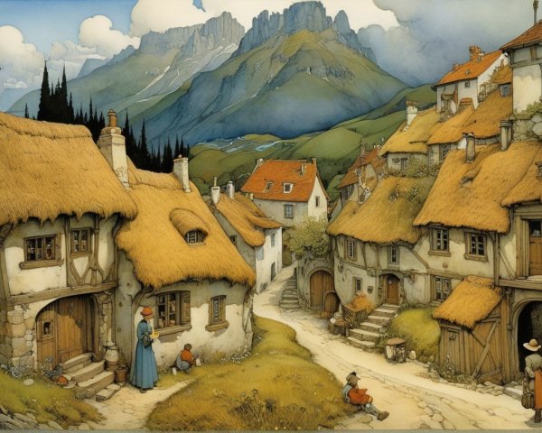 Prompt: Create an image depicting a young woman with long, auburn hair styled in loose waves, partially braided at one side. She is seated, focusing intently on a canvas in front of her, where another version of herself is painted. The painter is wearing a loose-fitting, white blouse with billowy sleeves, and her skin tone is fair with a subtle blush on her cheeks. Her bright blue eyes are full of concentration as she holds a paintbrush delicately between her fingers, poised to add details to her self-portrait.