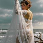 Dreamy hazy breezy Fragile Vision style. A long windswept haired beautiful woman in a flowing gossamer white dress sits at the edge of a pier, her silhouette a soft flame against the dark lake. Autumn leaves swirl like embers into the indigo water. The scene glows with October melancholy, textures of watercolor layered with muted oils, bokeh lights trembling like sighs.