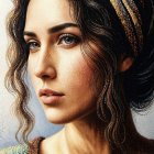Her hair is a rich chestnut color, styled in loose, soft curls that peek out from beneath the veil. The veil subtly hints at the gold and silver flecks that float around her, enhancing the mystical atmosphere. Her eyes are striking, an intense shade of amber that draws the viewer in, exhibiting depth and intrigue.
