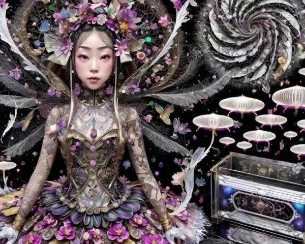 Prompt: Ethereal portrait of a beautiful ancient geisha princess. Iridescent Andean Patchwork. By Storm Elvin Thorgerson (artist) & worthy of Aivazovsky's brush (artist) & ∞