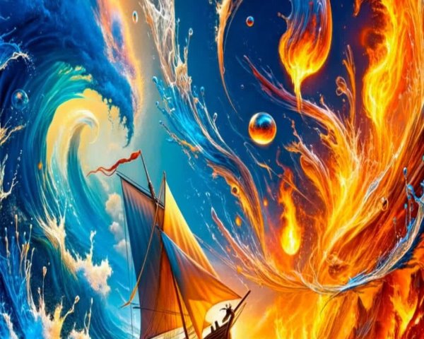 Prompt: Пляшет пламя в оке мира. Льются капли кристальной влаги в него. Ветер манит паруса надежды. В них купается он. Паруса несущие к оку мира тех кто ищет вдали от него.