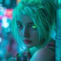 Prompt: Close up portrait of a cyberpunk woman with dark hair and gothic attire, sitting comfortably in a burly work chair in a dark night loft, happily holding one of her small pots while nurturing young shoots of green neon-like radiance planted in the pot. A room in an apartment. One artistic pink heart-shaped neon light, a tin roof, a bulky outdoor unit, and a computer connected to a dense power line. In the distance, a futuristic skyscraper rises, dazzling in neon. Happy.