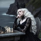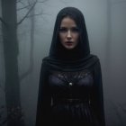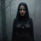 Prompt: Her deep green gown flows around her like water, hugging her feminine curves before cascading to the ground. Her dark seductive hair falls in loose waves, small leaves catching in her tresses like jewels. Her soft alluring brown eyes hold a sultry mystery, and the tilt of her lips as she catches your gaze feels like an invitation into her enchanted world.