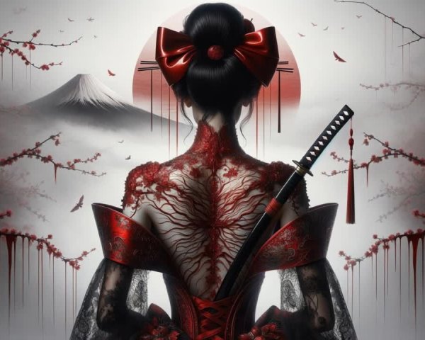 Prompt: This digital artwork depicts a woman with dark hair with bangs, a geisha style, pulled back into a high ponytail and a large red glossy bow. She is seen from the back. She is wearing a red dress with intricate lacing that resembles blood vessels from the muscles on her back and décolleté. The dress is made of shiny fabric, has a high neckline, and long lace sleeves with gold and black embroidery. She holds a samurai sword in her hand, which rests beautifully on her shoulders. The woman's face is painted with black and white makeup. The background is white, surrounded by splashes of red paint, fog, a crimson sunset against the backdrop of Mount Fuji, cherry blossoms, and crimson rose hips, creating an eerie and ominous atmosphere. The overall mood of the image is dark and ominous. The lush greenery of nature. Sharpness in the center. Bokeh. Focus. Detail. Quality. Perfectionism. Accuracy of the color scheme. Thick acrylic lines and pencil, oil paints. masterpiece, 8k, sharp focus.