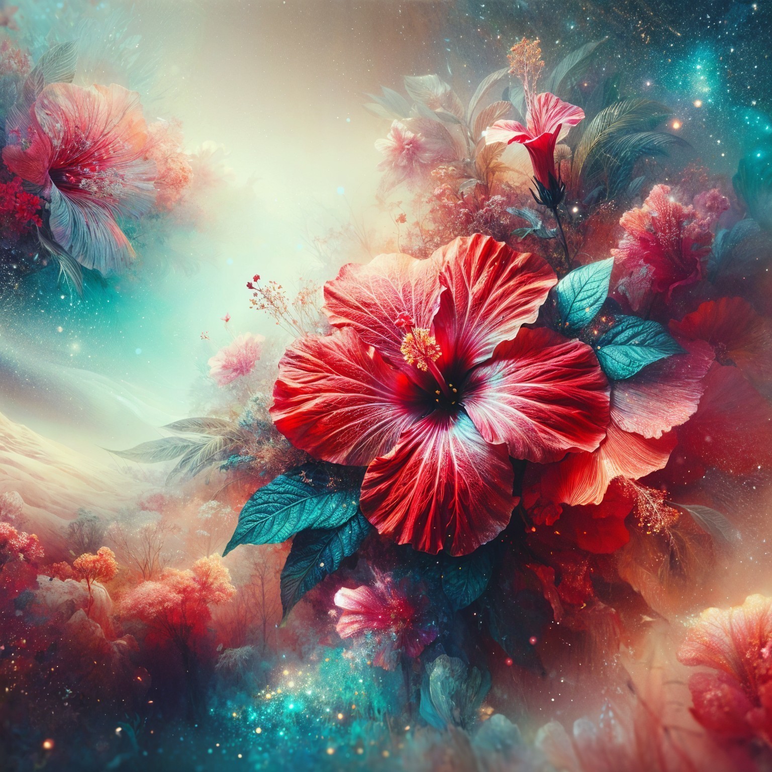 Prompt: Graceful hummingbird in flight, red lobelia flowers, honeysuckle blooms, macro view, dreamy and mystical ambiance, elegant pastel color palette, soft shades, fiery background, admired for gracefulness, detailed brushwork, ethereal atmosphere, enchanting and magical, high-quality painting, Art Nouveau inspiration, Artstation.