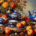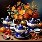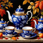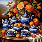 - The focal point is a beautiful, ornate **tea set of cobalt-blue porcelain**.