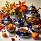 - It is decorated with intricate **gold leaf** and delicate **floral patterns**, possibly depicting rowan berries or other autumnal flowers, echoing the fruit in the scene.