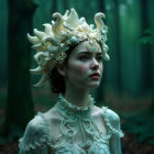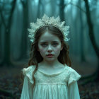 Prompt: A full body shot of a young woman with fair skin and abundant, wavy brown hair cascading over her shoulders, crowned by an intricate floral wreath of white, pink, and yellow blooms, sitting in a garden. She wears an off-the-shoulder floral dress adorned with delicate lace details and intricate floral embroidery, her hands clasped gently over her chest. A vibrant robin perches on her left shoulder, its feathers rendered with realistic detail, as she gazes with her brown eyes at it with an open-mouthed expression of shared song. They're framed within a lush moonlit garden under a large full moon, surrounded by glowing fireflies, shimmering butterflies, and hanging lanterns that cast a soft luminescence. Cinematic moonlight bathes the scene in a subtle rim light, enhancing the dreamy atmosphere amidst vibrant flora, while adhering to the rule of thirds composition for visual balance.