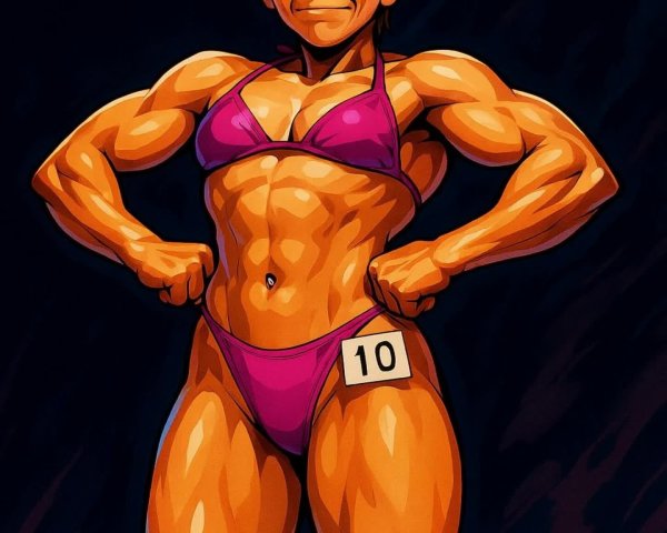 Prompt: Create an image of a muscular woman standing on a wooden pier, wearing a bright pink bikini with a bow detail. She has long, flowing hair that transitions in color from blonde to green. The background features a serene waterfront with a calm sky at sunset. The atmosphere is vibrant, showcasing her confident pose as she flexes her toned physique, highlighting her muscular legs and arms.Retro VHS Era punk Visuals, airbrush art cel-shaded ink drawing pencil sketch Doodle Addicts astral cosmic gouache Comsic Adventure anime style illustration artwork Done by Japanese Artist(s) by C.A.C Yamasaki and S.N.X." and Animated by David Production.