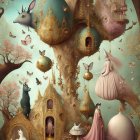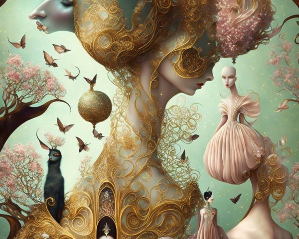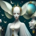 Prompt: The image features ethereal, stylized figures with delicate features, in a dreamlike, surreal atmosphere.Inspired by Dali, Klimt, Ray Caesar, Carrington, Burton, Erte, Lempinka.