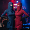 Prompt: A 4k, realistic image of a Muslim lady wearing a black burkini. She is standing in a pool on a sunny day. The background contains blue water and green plants.