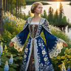 Whimsical Scene of Girl in Red Dress Among Flowers