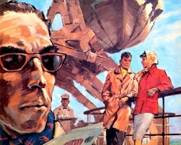 Prompt: Dramatic scene at concrete river levee with steel railings, horned devil figure materializing from swirling red smoke to snatch twenty dollar bills from scruffy vagabond's outstretched hand, money floating in mid-air as devil vanishes in spiraling mist, muddy river and industrial embankment visible, vagabond's jaw-dropped shocked expression, supernatural red and purple lighting effects contrasting with harsh streetlights, 1960s urban setting with power lines and chain-link fencing