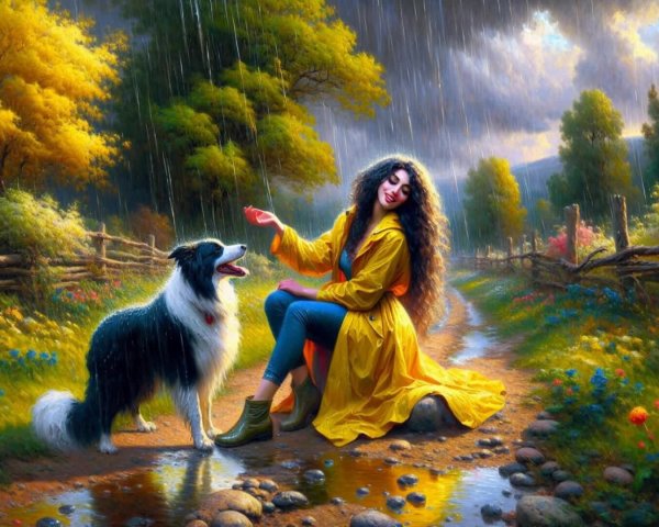 Prompt: Beautiful woman with long wild blue hair in a yellow raincoat is playing with a border collie on a deserted road in the spring rain. Refreshing atmosphere, enjoyment and emotional connection between them.