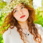 Prompt: Create an image of a young woman standing in water, partially submerged. She has a unique and striking hairdo resembling a green coral as well as a mushroom rhizom, set against a serene backdrop. Her skin tone is fair, and she has delicate, youthful facial features. She's wearing a flowing, intricate garment in shades of green with floral embroidery in warm colors, draping elegantly around her body. The background is adorned with aquatic plants and in the upper part with stylized clouds knwon from japanese woodcut aesthetics. Additionally, on the upper right side of the image, there's a radiant sun with an eye at its center and melting beams. The overall color palette is vibrant yet soothing, focusing on greens, blues, and warm accents.