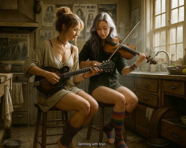 Enhancing the creative atmosphere, her thoughts are represented by swirling designs composed of tiny triangles and circles. The energetic colour palette—featuring shades of subtle blue, subtle orange, and subtle emerald and gold radiates outward, merging the realms of reality and imagination in a mesmerizing interplay of form and hue.