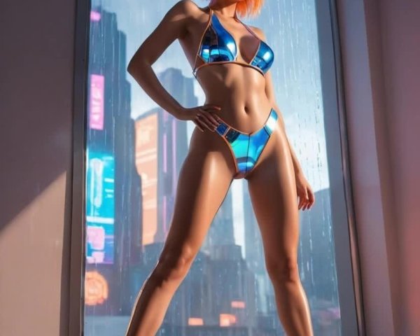 Prompt: blurred and pale watercolor, femjoy Cyberpunk, genre dancer in futuristic detailed setup wearing holographic attire, future lights reflecting on skin, sunny streets visible through a window, skimpy aesthetic, blue orange synthwave