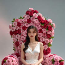 Prompt: Final campaign hero: the most gorgeous woman in flowing fashion gown, Avon lipstick + perfume glowing in her hand, surrounded by AI golden halo. Text: “Avon x AI – The Future of Beauty.”