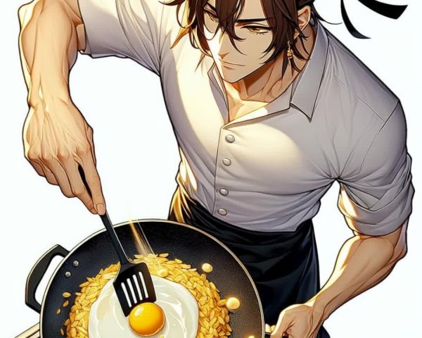 Prompt: Anime-style tall male with lean muscular build, shoulder-length tied brown hair, wearing a white short-sleeve chef uniform, black apron, and dark trousers, shaping a soft omelet over fried rice on a nonstick pan. Top-down angle showing golden egg texture, spatula movement, melted butter shine, and precise wrist control.
